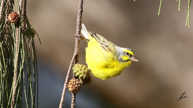 Zebra doves, so called due to the stripes on their body are happily walking on the ground looking for food, oblivious to human activity. They are joined by a very colorful bird called Red crested Cardinal. Java Sparrows with their colorful red beaks are flitting about. I perch myself besides a huge imposing tree, a few feet away from the Pacific Ocean to observe the early morning feeding frenzy on the tree filled with luscious red ripe berries. As mynas and bulbuls jostle with each other, a somewhat diminutive and colorful bird lands on the branches - the yellow fronted Canary! What a delight to watch as the canary maneuvers around upside down to feed on the berries.