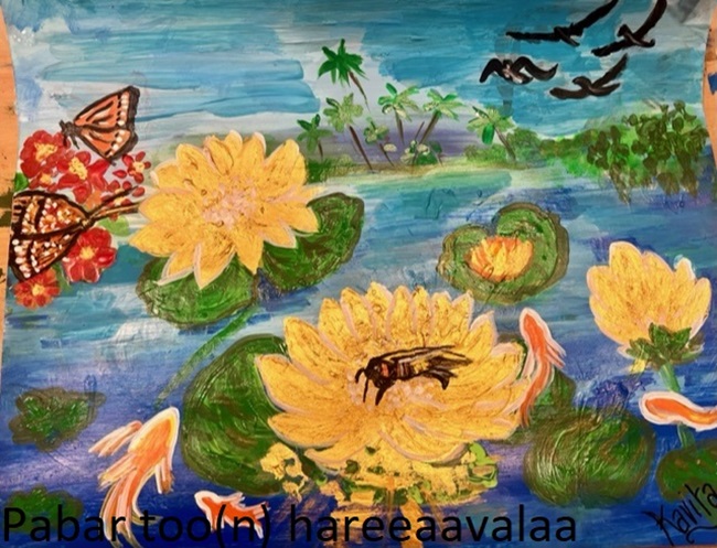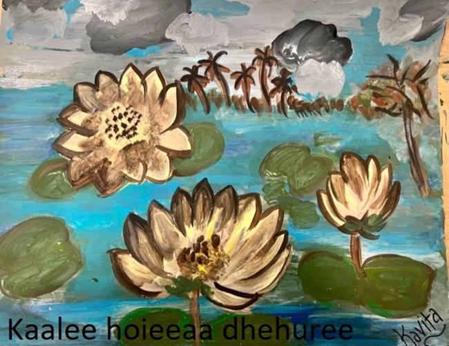 However, something tragic happened to the pond, the water became fetid and murky, and all the vegetation died, even the fish in the pond did not survive. There were no flowers or fruit left on the trees. Even the bumble bees searching for nectar amongst the lotuses moved away, and silence where one heard chirping of the birds.