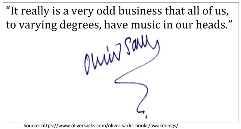 Oliver Sacks in his landmark book called Awakening has demonstrated the positive effects on mood and memory in the seniors. The fMRI reveals that music provides full-brain workout including Brain Stem, Motor Centers, Language Centers, Auditory Cortex, Emotion Centers, and Visual systems thereby giving cognitive boost. Music even provides memory-enhancing, mood-improving benefits; and it has even given birth to therapy called rhythmic auditory simulation and Sound Health Network. These interventions are helping Parkinson and Stroke patients.