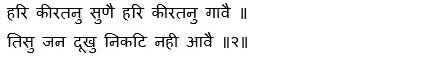 Translation: Listening to the Kirtan of the Lord's Praises, and singing the Lord's Kirtan, misfortune shall not even come near you. ||2||