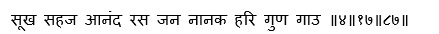 Translation: The essence of intuitive peace and bliss is obtained, O servant Nanak, by singing the Glories of God. ||4||17||87||
