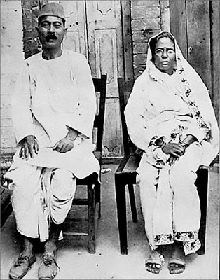 Premchand’s photograph is right in front of me. He is getting photographed along with his wife. He’s wearing a thick cloth cap, a kurta and a dhoti. The temples are flat, and the cheek bones are protruded, but the thick moustache makes the face look full.