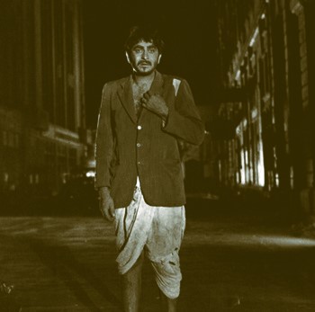 The film Jagte Raho tells the story of a jobless peasant in the metropolis who, while searching for water to drink in an apartment complex, is mistaken for a thief. Running from flat to flat to escape from his pursuers, the peasant comes across a range of vices, exposing middle-class greed and corruption. Raj Kapoor shed his popular Chaplinesque image and mannerisms to don the tattered dress of a terrified village simpleton with a shaggy beard, unkempt hair, and a bewildered look. Raj Kapoor barely speaks in the film, conveying his emotions through pantomime, except for a fervent denunciatory speech at the climax.