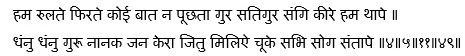 Dha(n)n dha(n)n guroo nanak jan keraa jit miliaai chooke sabh sog sa(n)taape. 4.5.11.49.”