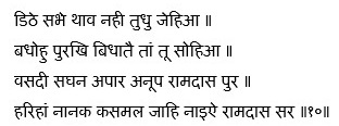 Translation: I have seen all places, but none can compare to You. The Primal Lord, the Architect of Destiny, has established You; thus, you are adorned and embellished. Ramdaspur is prosperous and thickly populated, and incomparably beautiful. O Lord! Bathing in the Sacred Pool of Raam Daas, the sins are washed away, O Nanak. ||10||