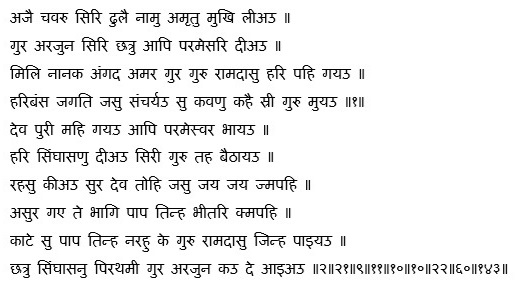 Translation: The invincible chaur, the fly-brush, waves over His head; with His mouth, He drinks in the Ambrosial Nectar of the Naam. The Transcendent Lord Himself has placed the royal canopy over the head of Guru Arjun. Guru Nanak, Guru Angad, Guru Amar Das and Guru Raam Das met together before the Lord. So, speaks HARBANS: Their Praises echo and resound all over the world; who can possibly say that the Great Guru (Ram Das) is dead? ||1|| When it was the Will of the Transcendent Lord Himself, Guru Ram Das went to the City of God. The Lord offered Him His Royal Throne and seated the Guru upon it. The angels and gods were delighted; they proclaimed and celebrated Your victory, O Guru. The demons ran away; their sins made them shake and tremble inside. Those people who found Guru Ram Das were rid of their sins. He gave the Royal Canopy and Throne to Guru Arjun and came home. |2||21||9||11||10||10||22||60||143||