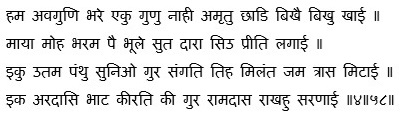 Translation: I am overflowing with sins and demerits; I have no merits or virtues at all. I have abandoned the Ambrosial Nectar (Naam), and I drank poison instead. I am attached to Maya and deluded by doubts; I have fallen in love with my children and spouse. I have heard that the most exalted Path of all is the Sangat, the Guru's Congregation. Joining it, the fear of death is taken away. Keerat the poet offers this one prayer: O Guru Ram Das, save me! Take me into Your Sanctuary! ||4||58||