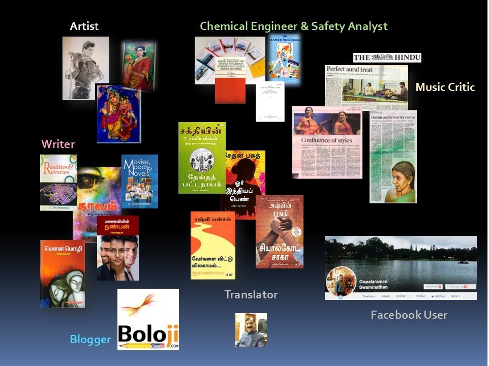 I donned several roles from artist to music reviewer, short story writer, translator, penned poetry, blogger, movie critic, and also a ferocious reader in English and Tamil. But not everything brought me money or catapulted me to great heights. It all helped me to relish life with my multiple activities apart from my basic profession as a chemical engineer and safety analyst.