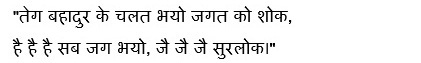 Translation: At Tegh Bahadur’s departure, the whole world was plunged in grief. They hailed his sacrifice, even the celestial realms echoed with his glory.