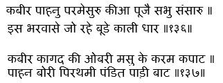 Kabir, the religious world has turned a stone into a god and the whole world worships it. Those keeping such a belief (that worship of stone is actually worship of God) will drown in the river of ignorance. 136.