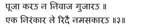 Translation: I do not perform Pooja (Hindu worship services), nor do I offer Namaz (the Muslim prayers). I have taken the One Formless God into my heart; and I humbly bow my head to Him (in reverence). ||3||