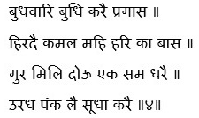 On Wednesday (as a result of devotional worship), one’s understanding becomes enlightened. Then God will be experienced in the lotus of the heart. Through the Guru’s teachings the lotus heart (pure, untainted by desires, thoughts) becomes One with God (thus the Oneness is experienced within). (As a result) The inverted lotus blossoms and is turned upright. (This not a physical blossoming but a subtle blossoming as one feels the divine connection within.) ||4||